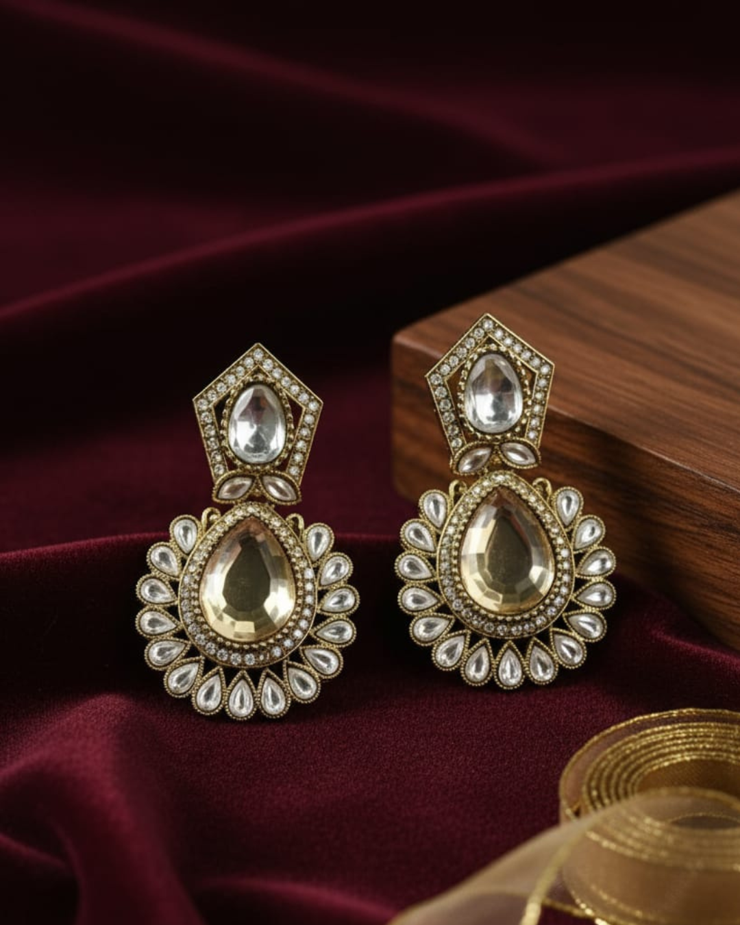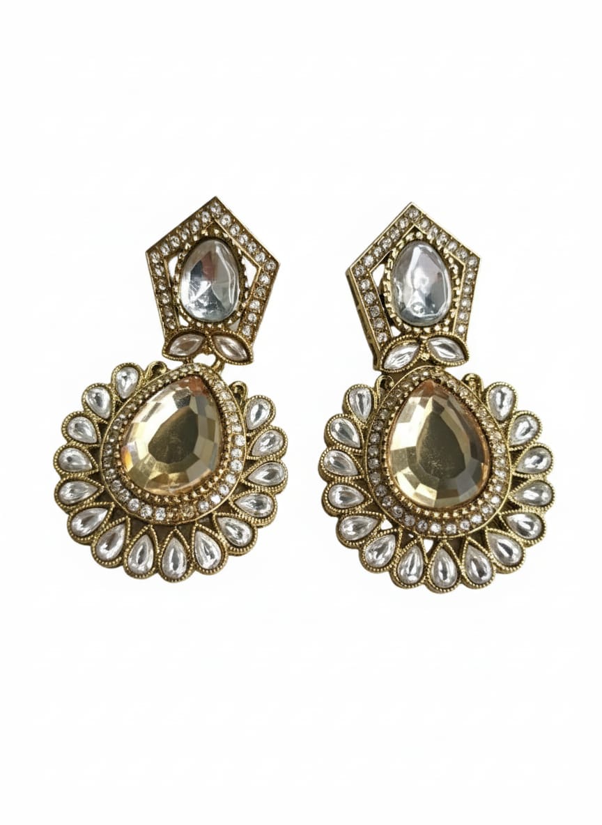 Make a regal and unforgettable statement with these magnificent Antique Gold Plated Indian Drop Earrings. Inspired by classic Kundan and Polki artistry, these earrings feature a rich, oxidized antique gold finish that provides a deep, traditional look. Each piece is brilliantly embellished with high-quality Cubic Zirconia (CZ) / American Diamond (AD) stones in a dazzling white and light-champagne color combination. The intricate floral-style setting and dangling design ensure that these ethnic statement earrings catch the light beautifully from every angle. Perfect for the Bride, Bridesmaid, or any guest attending a Wedding, Sangeet, Haldi, or festive occasion like Diwali and Eid. These traditional Bollywood-style earrings are designed to complement Sarees, Lehengas, and Anarkalis, adding an heirloom-like touch to your most special moments. Lightweight for their size, they offer comfort without compromising on grand, luxurious style.