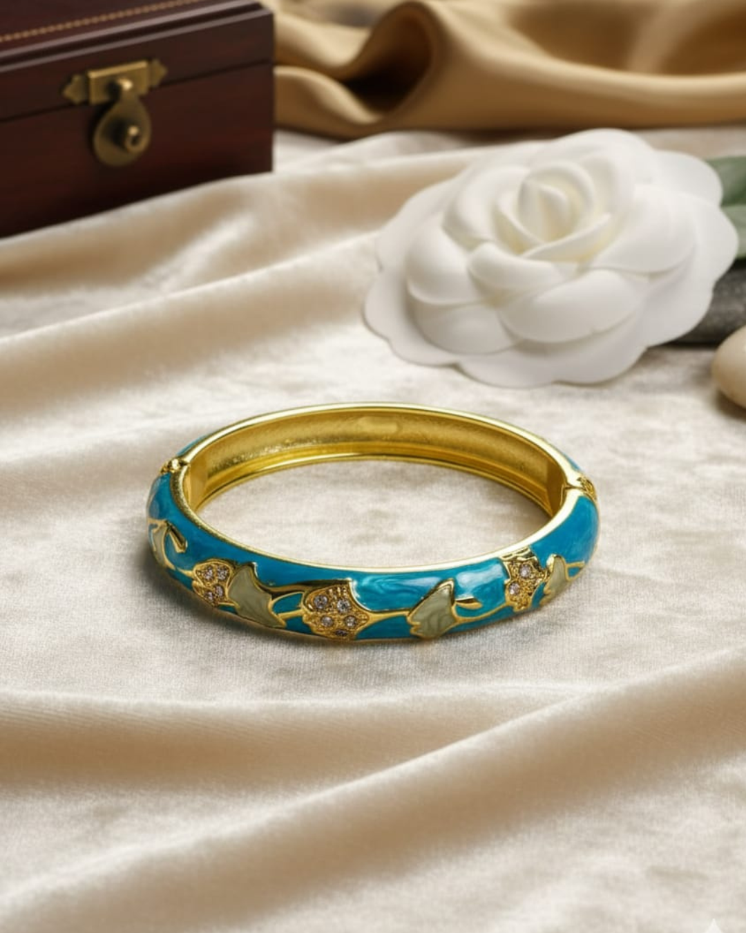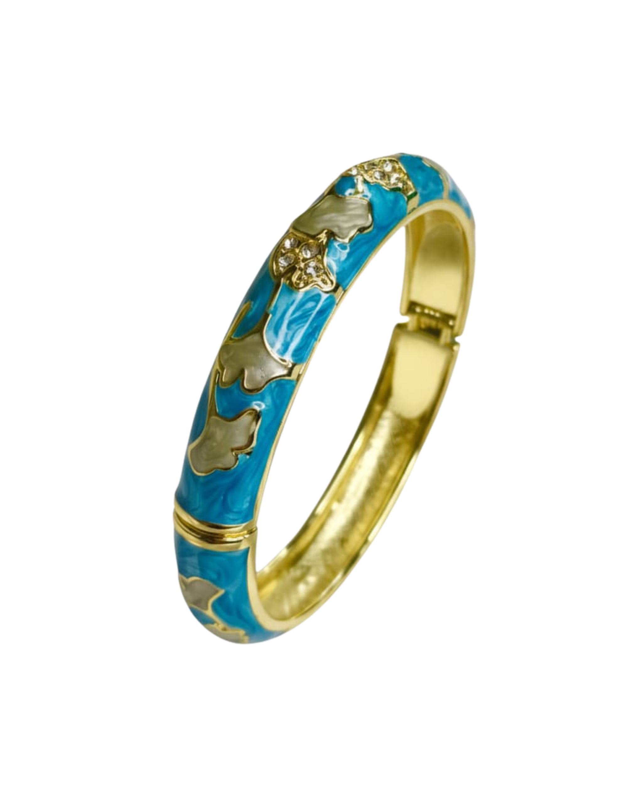 A Symphony of Art and Adornment Discover the pinnacle of wearable art with the Azure Ginkgo Enamel Bangle. Conceived for the modern connoisseur who values unparalleled craftsmanship and symbolic design, this statement piece is a signature of refined style. It seamlessly elevates any look, from daytime chic to evening elegance, promising to be your most admired and versatile accessory. The Art of Creation Our artisans have masterfully fused old-world enameling techniques with a contemporary aesthetic. The deep, oceanic azure of the enamel is meticulously inlaid into the polished, high-shine metallic framework, creating a perfect canvas for the delicate, pearlescent ginkgo leaves that seem to float across its surface. The warm, luminous hue of the setting provides a breathtaking contrast to the cool, vibrant enamel, resulting in a piece of harmonious and captivating beauty. A Symbol of Enduring Elegance The ginkgo leaf, the central motif of this exquisite design, has been revered for centuries as a symbol of peace, hope, and longevity. To wear this bangle is to carry a personal token of resilience and timeless grace. Subtle crystal accents catch the light, offering a delicate glimmer that speaks of quiet confidence and understated luxury. An Investment in Timeless Style With its secure hinged clasp and smoothly polished interior, the Azure Ginkgo Bangle is crafted for exceptional comfort and lasting beauty. This is not a fleeting trend; it is a collector’s piece, an investment in a style that endures. Make it the cornerstone of your jewelry collection or present it as an unforgettable gift to someone truly special. Claim this exquisite piece for your collection and let your style tell a story of elegance and artistr